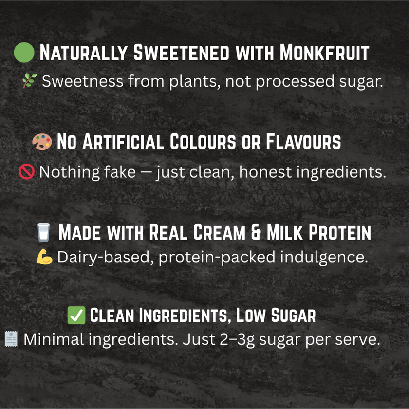 From rich Chocolate Fudge to smooth Vanilla Custard, every tub is crafted to satisfy your sweet tooth without compromising your health goals. Whether you’re a fan of fruity Mango, bold Cappuccino, or indulgent Salted Caramel, our high-protein, low sugar ice creams are designed to deliver real flavour with a clean label. Discover the joy of guilt-free indulgence — one scoop at a time.
